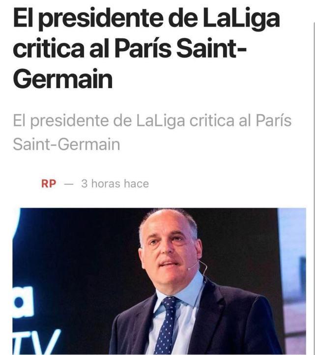 西甲联盟主席特巴斯在接受采访时,对于巴黎圣日耳曼近几个赛季在转会市场的大肆引援,相当不满,特巴斯怒喷大巴黎道:“像他们这样的国家俱乐部(指巴黎圣日耳曼背后有卡塔尔王室的支持),对于足球生态系统来说,与欧超联赛一样危险。我们此前批评欧超,因为它将摧毁足球。而现在,我们同样也要批评巴黎圣日耳曼。” 显然,在特巴斯看来,大巴黎在转会市场的疯狂引援,同样也在“摧毁足球”。