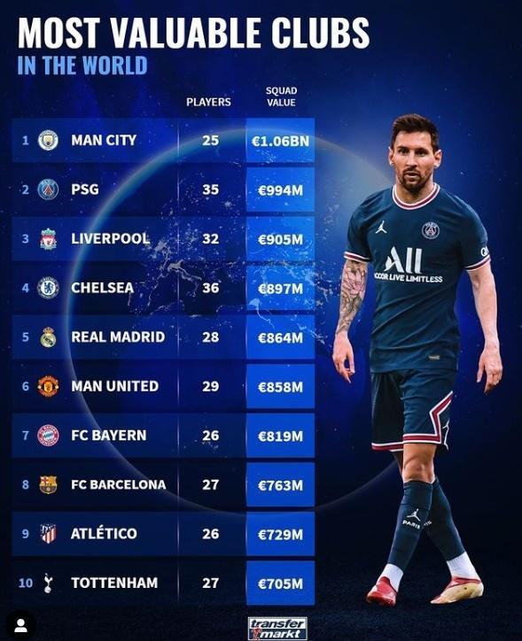 24直播网讯 今日,《转会市场》统计了俱乐部总身价情况,其中,曼城位居榜首,刚刚引进梅西的巴黎位居次席