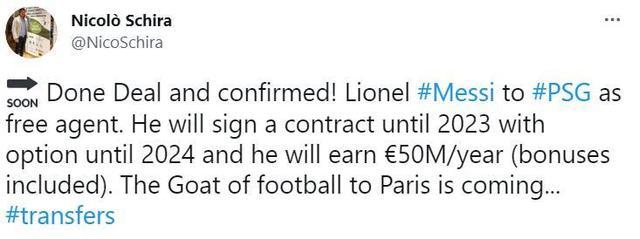 斯基拉表示,成交确认!梅西将以自由身加盟巴黎,并与巴黎签下一份2+1的合同,年薪5000万欧元。