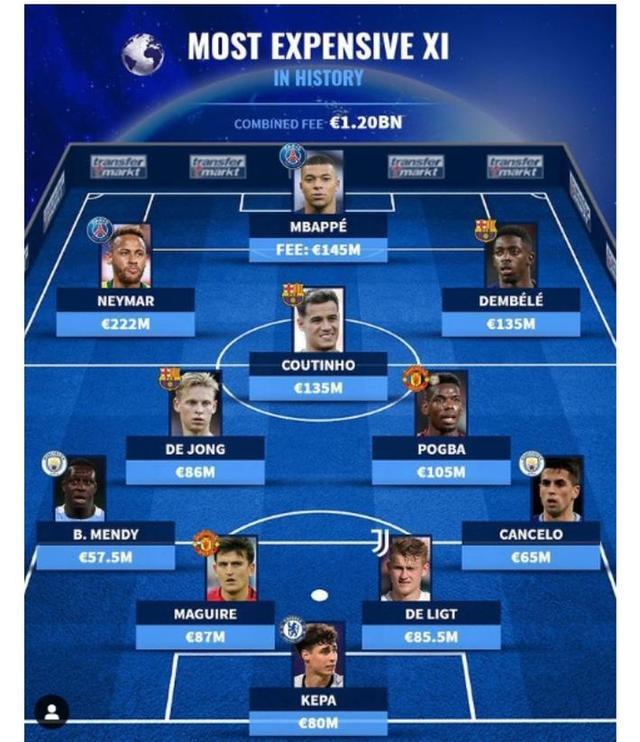 前锋:姆巴佩1.45亿欧(摩纳哥-巴黎)、内马尔2.22亿欧(巴萨-巴黎)、登贝莱1.35亿欧(多特-巴萨)
