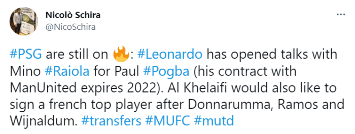 斯基拉表示,莱昂纳多已经和拉伊奥拉就博格巴的转会开启谈判,博格巴与曼联的合同还剩1年,巴黎主席纳赛尔在签下唐纳鲁马、拉莫斯、维纳尔杜姆后,仍希望再签下一位顶级球星。