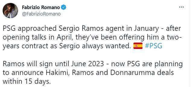据法国RMC体育报道,巴黎圣日耳曼已经与拉莫斯谈妥转会,他们将免签这名前皇马队长,双方签约两年,体检很快进行。RMC表示,拉莫斯拒绝了两份来自英超的报价,其中一份薪酬比巴黎开出的还要高。