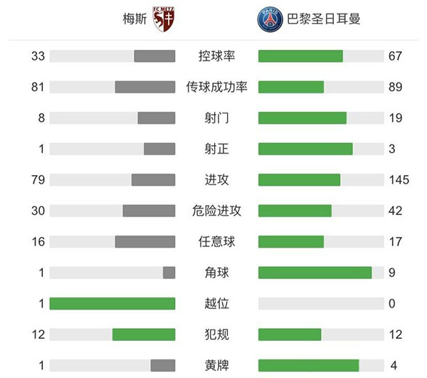 全场比赛结束,巴黎3-1击败梅斯