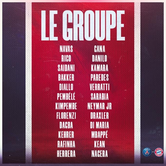 巴黎战拜仁名单出炉:姆巴佩搭档内马尔 马尔基尼奥斯缺阵