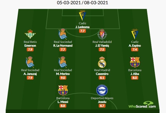 后卫:埃莫森(贝蒂斯,7.9分)、罗宾-勒曼诺德(皇家社会,7.7分)、埃尔亚米克(巴拉多利德,7.5分)、埃斯皮诺(加的斯,7.4分)
