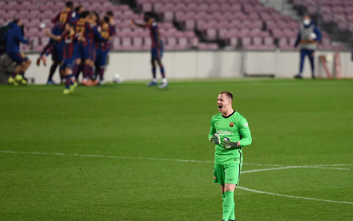 来源:24直播网03-04 19:4824直播网3月4日讯 国王杯半决赛次回合巴萨上演神奇逆转,他们在主场通过加时赛以3-0击败塞维利亚,总分3-2逆转对手,挺进到了本赛季国王杯决赛。这场比赛巴萨赢得非常惊险,登贝莱早早取得进球,但塞维利亚获得点球,好在特尔施特根神奇扑点成功,如果点球打进的话,巴萨需要再进3球才行。接下来神剧情出现,常规时间内第93分08秒,皮克进球扳平比分,比赛进入到加时赛。加时赛布莱斯维特头球为巴萨反超,巴萨顶住压力,成功晋级到国王杯决赛。
