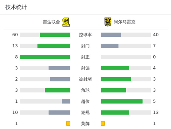 第10分钟,山凯蒂右路接队友分球插上杀入禁区低射被门将挡出,卡马拉禁区中路得球补射将球打进,吉达联合1-0阿尔马雷克。