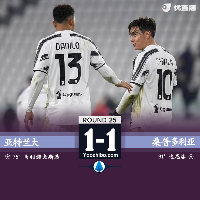 24直播网2月14日讯 北京时间2月14日凌晨3:45,2021-22赛季意甲联赛第25轮,尤文图斯客场挑战亚特兰大。上半场两队均无建树,下半场莫拉塔失良机,弗拉霍维奇爆射被斯波蒂耶洛扑出,马利诺夫斯基世界波破门,达尼洛补时绝平,最终尤文图斯1-1战平亚特兰大。