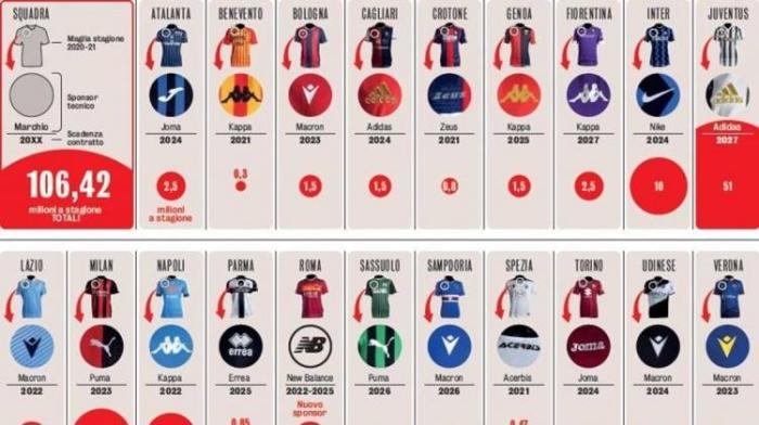 由于罗马与新百伦签约,因此《米兰体育报》对意甲20支球队的球衣赞助费进行了重新的统计,其中尤文图斯每年可以从阿迪达斯得到5100万欧元的赞助费,几乎是其他意甲19支球队的总和。而意甲20支球队的球衣赞助费总额为1.06亿欧元。