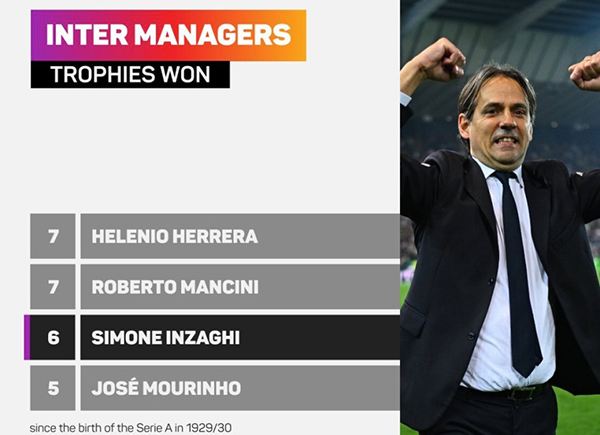 执教国米3年,小因扎吉已经率队豪夺6个冠军,包括3个意超杯冠军、2座意大利杯冠军,还有这座沉甸甸的意甲冠军。小因扎吉也就此超越了在国米拿到5座冠军奖杯的穆里尼奥,仅次于曾7次率领国米夺冠的埃莱尼奥-埃雷拉和曼奇尼,位列国米队史第3位。