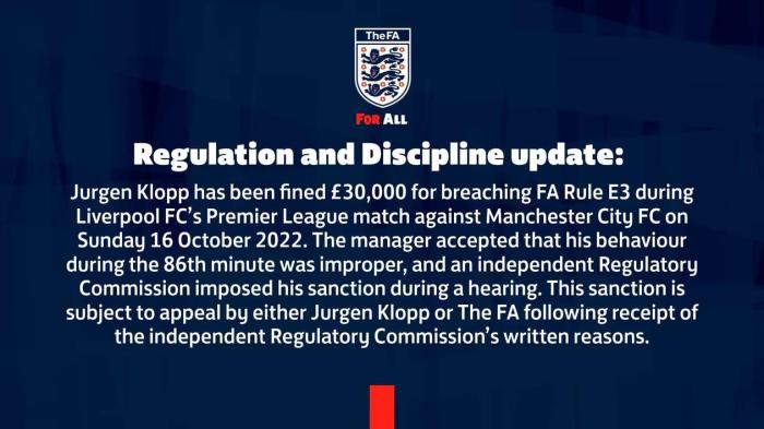24直播网10月28日英足总官方消息,克洛普因在利物浦战曼城的比赛中行为不当,被罚款3万英镑,但公告并未提及禁赛。