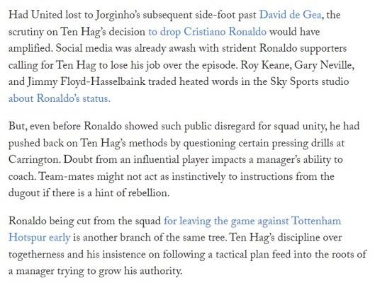 这位曼联跟队记者透露,在C罗公开表现出对球队团结的漠视之前,他就已经通过质疑卡灵顿的某些关于高位逼抢的训练,来抵制甚至反抗滕哈格的训练方法。来自有影响力球员的质疑,显然会影响主教练在执教方面的威信的。因为如果有这种“反对主帅”的迹象,队友可能不会本能地听从教练席的指示。