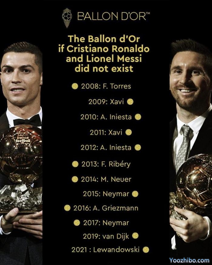 官方晒若无梅罗金球奖得主:内马尔两次夺魁