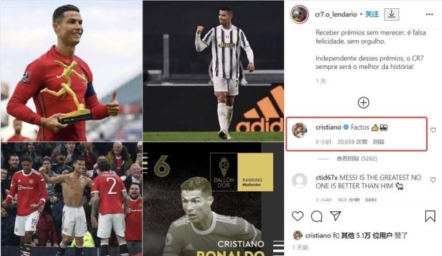手滑?粉丝为C罗鸣不平称梅西得奖肮脏可耻!C罗点赞评论:事实