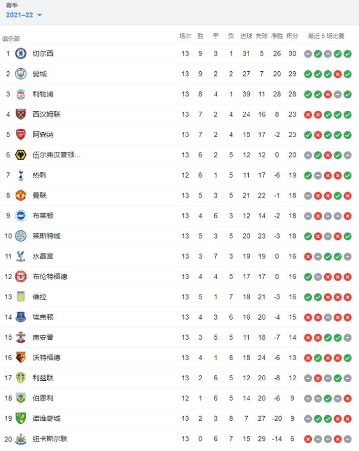 24直播网讯 目前,英超除了伯恩利和热刺之外都踢了13轮比赛,切尔西积30分继续领跑积分榜,赢球的曼城和利物浦分别以29分和28分分列二三位,最后一个欧冠席位由西汉姆占领,他们与阿森纳同积23分,因净胜球优势排名第四,阿森纳排名第五。