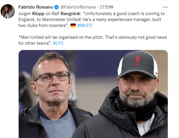 克洛普表示:“不幸的是一名优秀的教练将来到英格兰,来到曼联。他是一名经验非常丰富的主帅,将两家俱乐部从无到有(莱比锡红牛和霍芬海姆)。”
