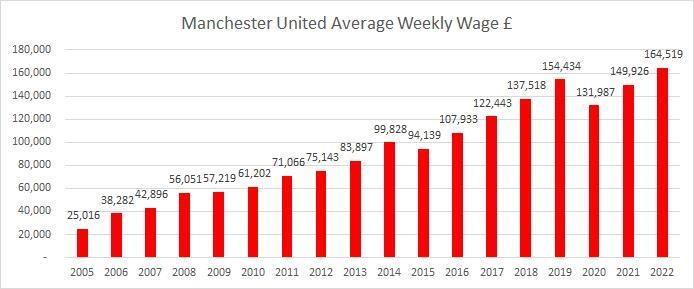 曼联在05-06赛季的平均周薪为25016镑,到16-17赛季突破10万镑,而本赛季,红魔的平均周薪达到了创纪录的164519镑。