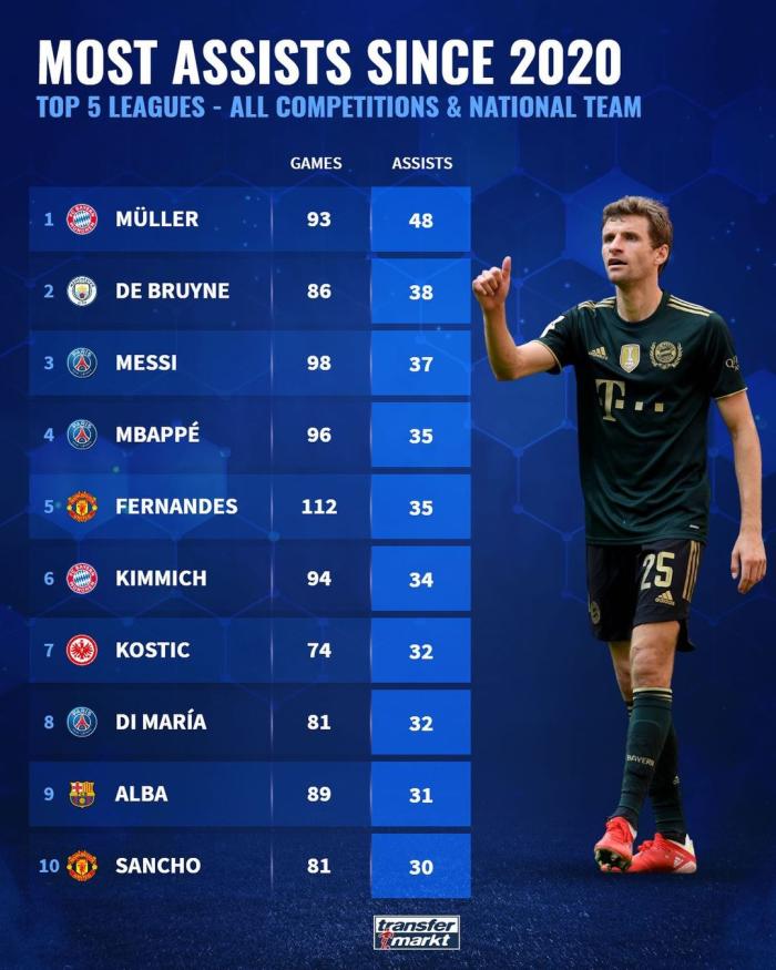 而助攻方面,排名榜首的是穆勒的93场48助攻,而排名第二的是德布劳内的86场38助攻,第三则是梅西的98场37助攻,而第四是姆巴佩的96场35助攻,第五是B费的112场35助攻,第六是基米希的94场34助攻,第七是科斯蒂奇的74场32助攻,第八是迪玛利亚的81场32助攻,第九是阿尔巴的99场31助攻,第十是桑乔的81场30助攻。而助攻方面,穆勒是独一档的存在。