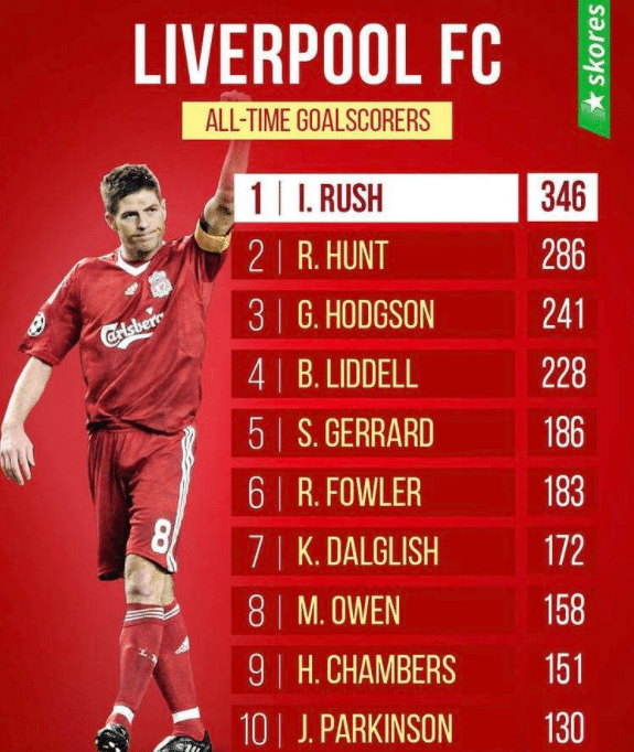 而利物浦方面队史最佳射手是伊恩拉什,他代表利物浦打进了346球,随后是亨特的286球,霍奇森的241球,利德尔的228球,杰拉德的186球,福勒的183球,达格利什的172球,欧文的158球,查姆贝斯的151球和帕金森的130球。可以看出,利物浦的历史确实辉煌,不过英超时期的利物浦,真的不怎么样。