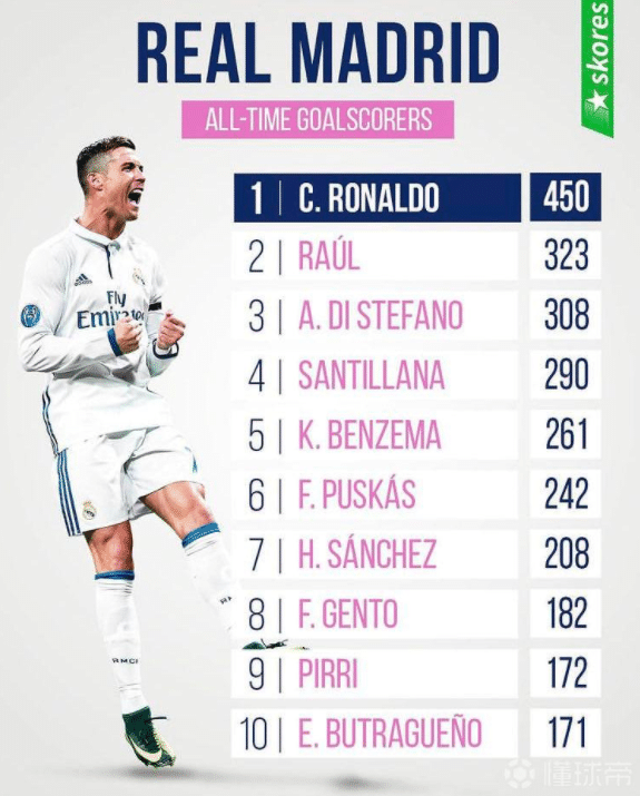 如图,皇马历史射手王是C罗,他代表皇马打进了450球,不过如果不是老佛爷一定要送走C罗,这个数字可能会更高。而第二的是劳尔,他帮助皇马打进了323球,第三是斯蒂法诺,他代表皇马打进308球,随后是桑迪利亚纳的290球,本泽马的261球,普斯卡什的242球,桑切斯的208球,亨托的182球,皮里的172球和布特拉格诺的171球。
