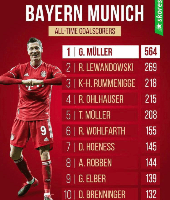 随后是拜仁,拜仁队史进球最多的球员是传奇前锋穆勒,他代表拜仁打进564球,随后是莱万的269球,看来莱万是无望超越穆勒了。而第三的是鲁梅尼格的218球、奥尔豪泽的215球,穆勒的208球,沃尔法特的155球,赫内斯的145球、罗本的144球,埃尔伯的139球和布轮宁格的132球。
