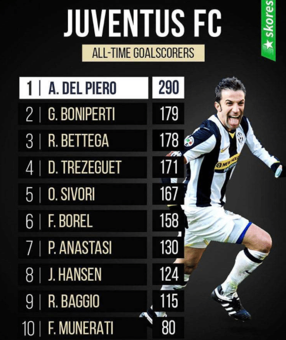 最后是尤文,尤文队史最佳射手是皮耶罗,他代表尤文打进290球,随后是博尼佩尔蒂的179球,贝特加的178球,特雷泽盖的171球,西沃里的167球,博莱尔的158球,阿纳斯塔西的130球,汉森的124球,巴乔的115球和穆内拉蒂的80球。需要说一下的是,C罗很快就可以进入尤文射手榜前十哦,到时候他会成为第一位进入两支豪门球队射手榜前十的球员。