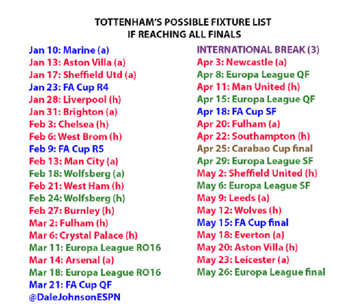 近日,ESPN记者统计了热刺在本赛季剩下的赛程,如果热刺可以进入欧联杯和足总杯的决赛的话,球队需要在123天内踢38场比赛,平均3.24场比赛,不得不说这个赛程真的是非常密集。从目前到5月26日本赛季结束,热刺还有22场英超比赛,1场联赛杯决赛,而欧联杯至少2场,足总杯至少1场。如果球队在欧联杯和足总杯都能晋级的话,那么热刺还要踢6场足总杯和9场欧联杯,一共是38场比赛。