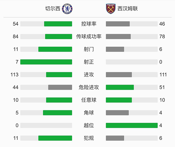 第10分钟,切尔西取得领先,芒特开出角球,蒂亚戈-席尔瓦高高跃起头球冲顶破门,切尔西1-0西汉姆。