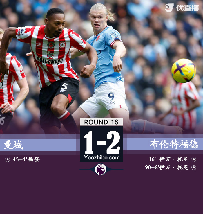 24直播网11月12日讯 北京时间11月12日20:30,英超联赛第16轮曼城主场迎战布伦特福德的比赛,上半场托尼头球吊射破门,福登补时爆射扳平。半场结束,曼城1-1布伦特福德。下半场补时托尼门前推射绝杀,最终,曼城1-2爆冷不敌布伦特福德,曼城4连胜被终结。